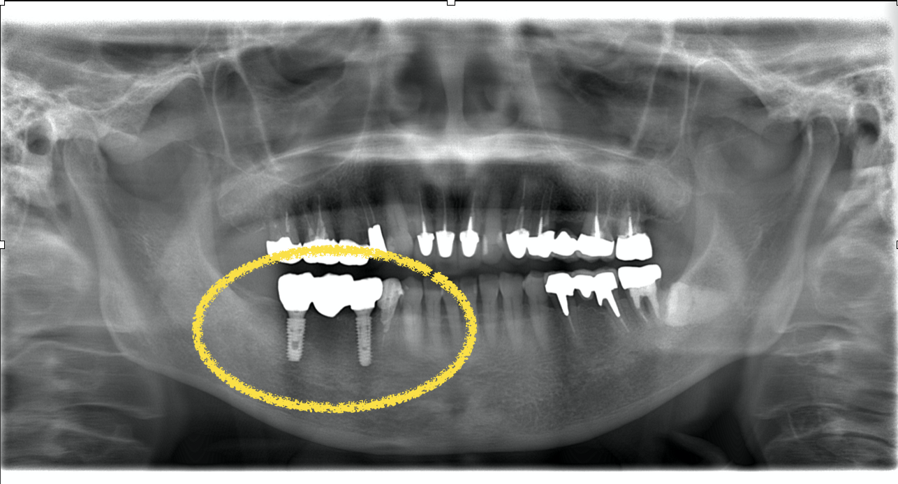 右下2本の大臼歯が欠損しており、さらに1本の小臼歯が根っこだけになっています。