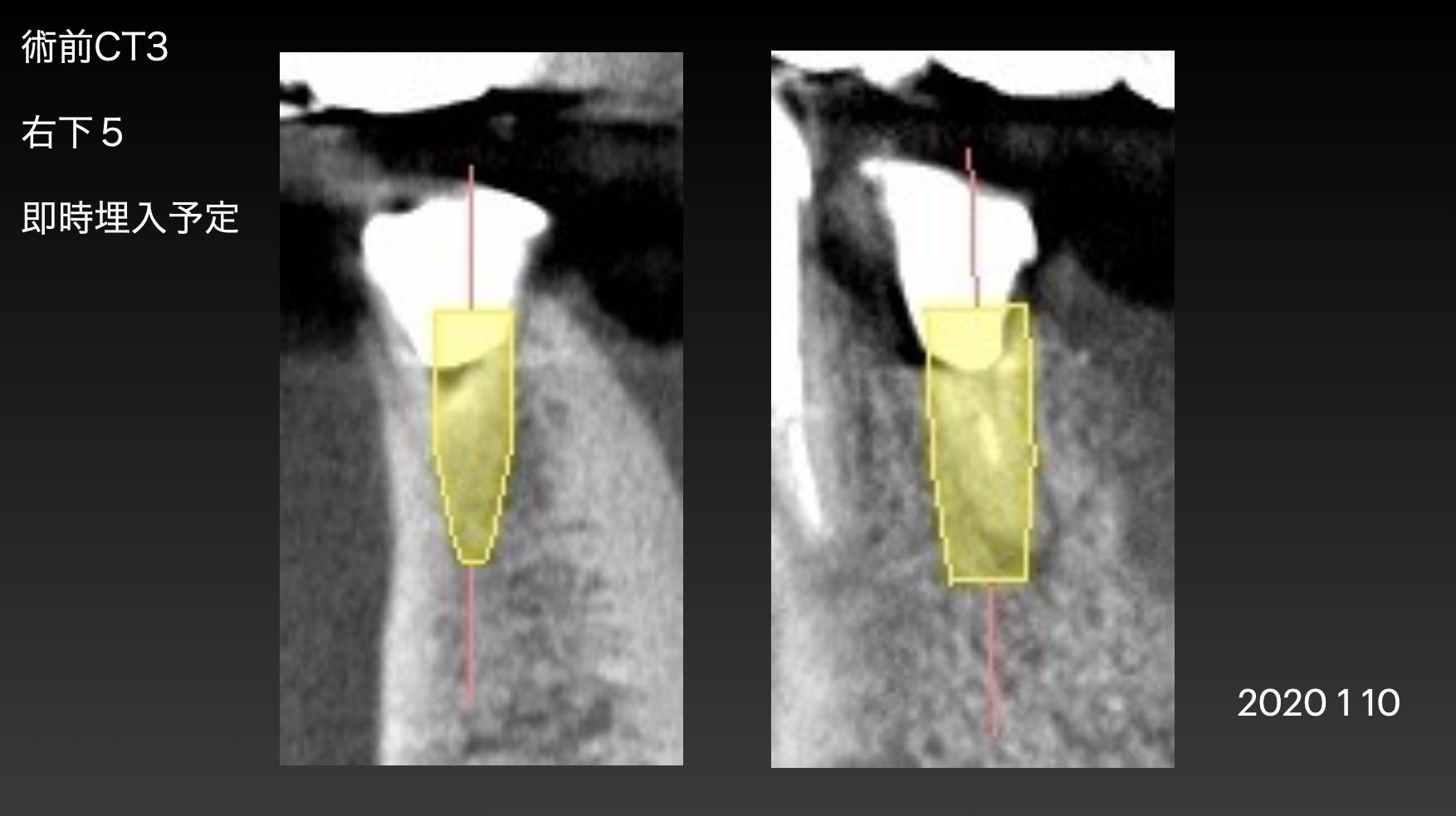 インプラント抜歯後即時埋入ができるかどうか判断します。歯の根っこの形によって、インプラントの太さや長さを変えます。また、この画像で抜く予定の歯の周囲に膿みや感染病巣がある場合は、即時でなく通常の手術プランに変更します。