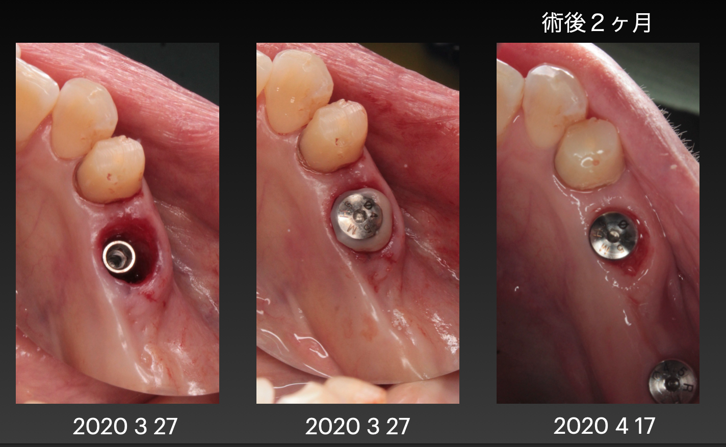 1番右の画像が手術後2ヶ月のものです。インプラントの周りの隙間は無くなっており、うまく治癒できたのが確認できます。