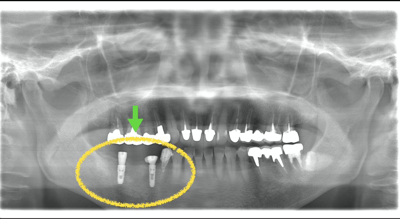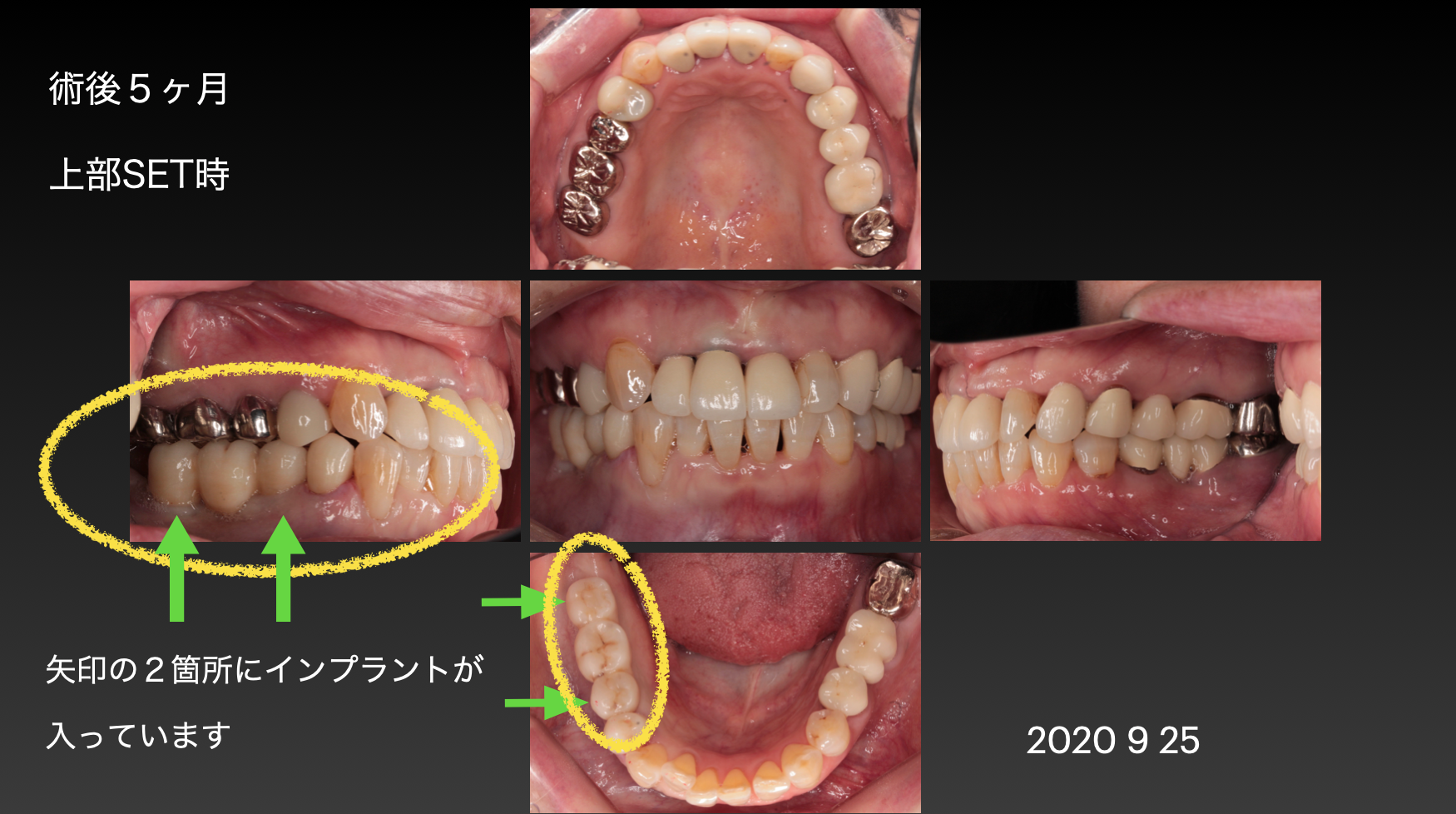 このケースでは手術後約4ヶ月でインプラント部に歯が入りました。黄色い枠線で囲ってある3本の歯がインプラントの歯です(ジルコニア)。