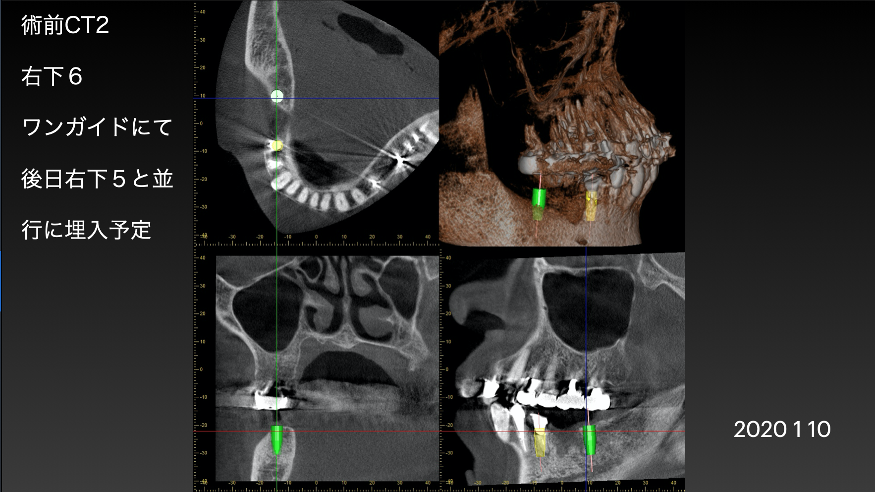緑が大臼歯用インプラント、黄色がまだ歯が残っている所にいれる小臼歯用インプラントです。(シュミレーション)